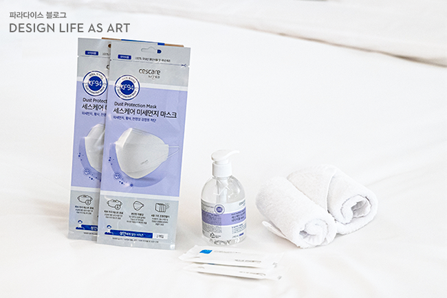 또한 호텔에 머무르는 동안 개인위생을 챙길 수 있도록 ▲KF94 마스크 ▲손 소독제 ▲안심 물티슈로 구성된 ‘세스코 바이러스 케어 키트’도 객실당 한 세트씩 증정합니다. 여분 마스크와 간편하게 휴대할 수 있는 위생용품으로 객실 안팎에서 편안한 시간 보내시길 바랍니다.