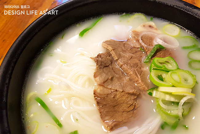 먼저 핏물을 제거한 양지와 잡뼈를 준비하고, 이 재료를 1차로 삶은 육수는 부유물과 잡내를 제거하기 위해 모두 버립니다. 양질의 육수를 얻기 위해 반드시 진행해야 하는 과정이죠. 1차로 삶는 과정을 마친 후에는 정성을 들여 24시간 동안 끓여 뽀얗게 사골육수가 우러나고, 이 때 핏물을 제거한 양지를 넣어 다시 끓입니다. 도가니와 스지는 별도로 삶아 불순물을 제거한 후, 양지와 함께 우려낸 사골 육수에 넣어 다시 끓여줍니다. 이 과정을 거치면 텁텁한 맛 없이 풍미가 가득한 사골 육수를 얻을 수 있습니다.