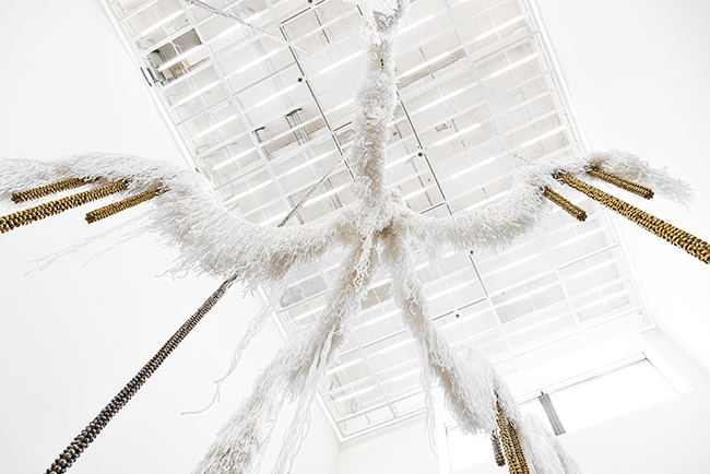 <소리 나는 동아줄> 역시 <소리 나는 조각> 연작 중 하나입니다. 금속 링과 방울을 연결해 만든 약 15m의 줄은 천장에서부터 바닥에 닿을 정도의 길이로 내려옵니다. 손잡이를 이용해 동아줄을 흔들 때 나는 소리는 작품 옆 창문을 통해 우리의 청각을 시각으로 확장하는데요. 시련을 겪는 전래동화 속 주인공이 동아줄로 현실을 벗어났던 것처럼, 이 작품은 우리를 현실 밖으로 인도하는 듯한 특별한 경험을 선사해줍니다.