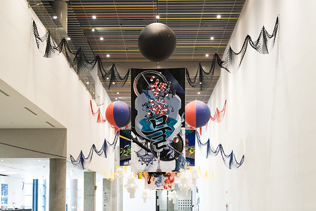 <오행비행>은 모더니즘과 토템, 추상과 형상 등의 이분화 되는 표현을 경계하는 작가의 태도를 보여주는 작품입니다. 현수막에 표현된 강렬한 그래픽과 과장된 글자들은 마치 선전물 같은 인상을 자아냅니다. 다섯 점의 현수막이 풍선에 매달려 떠 있는 형상은 그 모양만큼 다양한 의미를 담고 있는데요. 오방색(검정, 파랑, 빨강, 노랑, 흰색)은 ▲물 ▲나무 ▲불(열) ▲흙(땅) ▲철(금)을 상징합니다. 각각의 원소를 상징하는 오브제를 통해 작가가 생각하는 오늘날의 부유하는 현실을 들여다볼 수 있는 작품입니다.