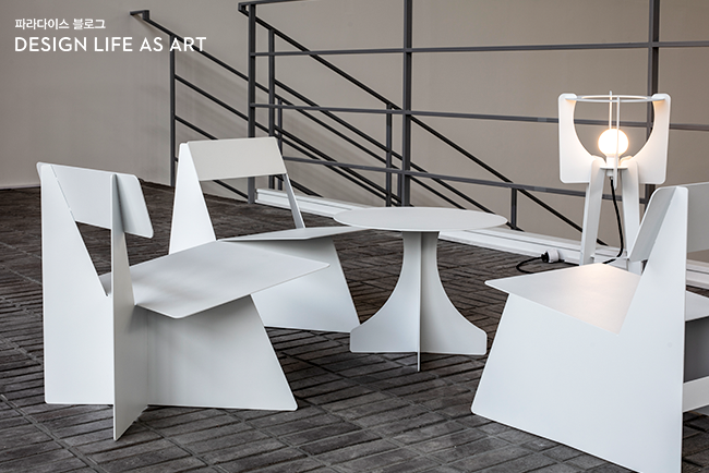 <브라더스 콜렉션>에서 한 장의 판재를 남김없이 사용하여 테이블과 의자, 조명을 제작했습니다. 의자로 시작한 <포브라더스>에 조명과 테이블이 추가되면서 공간 구성으로 확장된 것이죠. 문승지 작가는 이것이 집이 될 수도 있고 도시를 이룰 수도 있다고 생각한다며 추후에는 가구를 넘어 공간과 삶의 영역까지 넘나드는 컬렉션으로 발전시킬 예정임을 밝혔습니다.