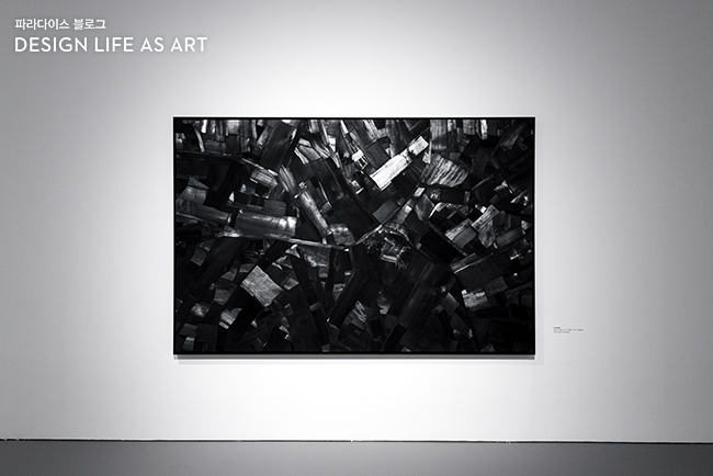 가장 먼저 보이는 작품은 ‘숯의 작가’ 이배의 <Issu du feu ch-11>입니다. 숯을 잘라 캔버스에 붙인 뒤, 표면을 연마하여 만들어진 이 작품은 빛으로 인해 각도에 따라 다르게 보이는 숯의 표면이 특징입니다. 이 외에도 한지의 물성이 드러나는 박서보의 묘법 작품과 캔버스에 맺힌 이슬을 모티브로 시작된 김창열 작가의 작품을 감상할 수 있습니다.