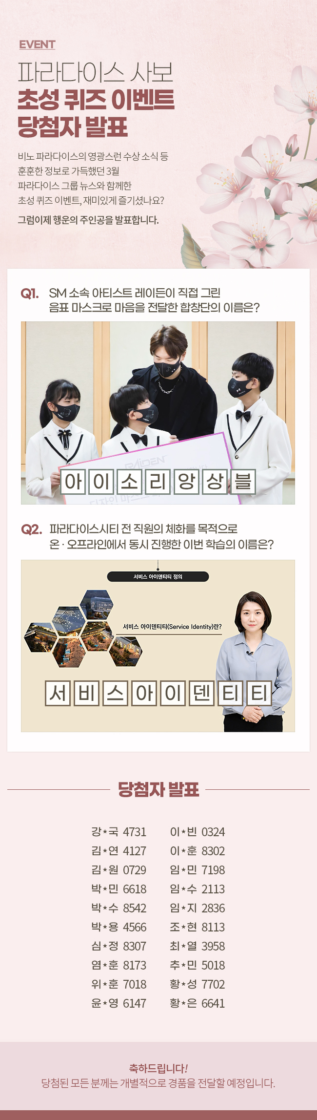 비노 파라다이스의 영광스런 수상 소식 등 훈훈한 정보로 가득했던 3월 파라다이스 그룹 뉴스와 함께한 초성 퀴즈 이벤트, 재밌게 즐기셨나요? 그럼 이제 행운의 주인공을 발표합니다.