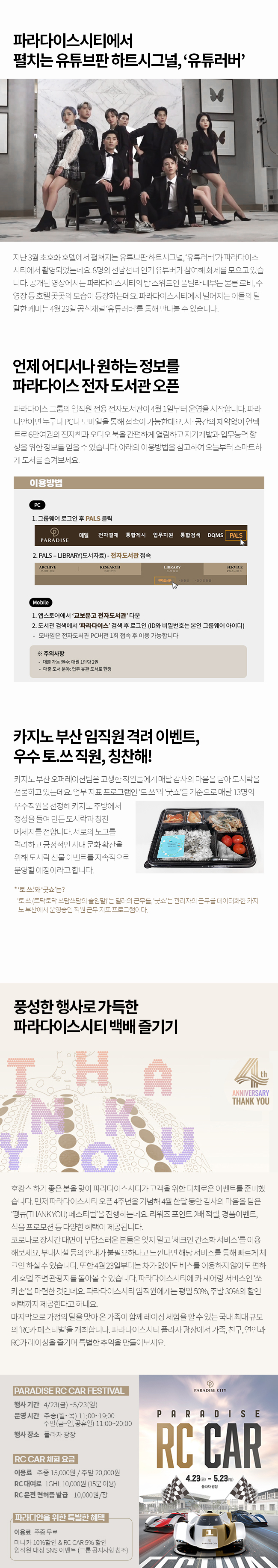 활짝 핀 봄의 꽃처럼 파라다이스의 4월은 다양하고 풍성한 소식으로 가득했습니다. 올해로 네번째 생일을 맞이한 파라다이스시티의 다채로운 이벤트 정보는 물론 언텍트로 즐길 수 있는 파라다이스 전자 도서관 이용방법까지 읽어두면 도움되는 유용하고 알찬 소식을 확인해보세요.