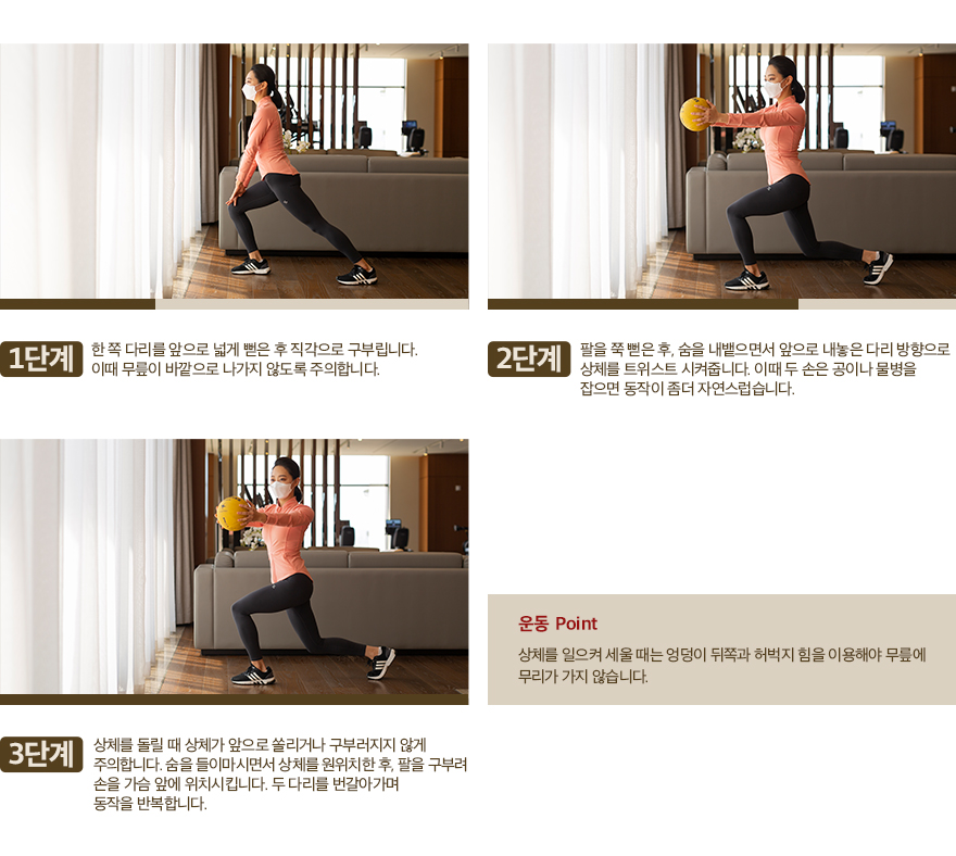 • 운동 효과: 하체운동인 런지에 상체를 비틀어주는 동작을 더해 복부는 물론 몸 전체 근육을 밸런스 있게 강화하는