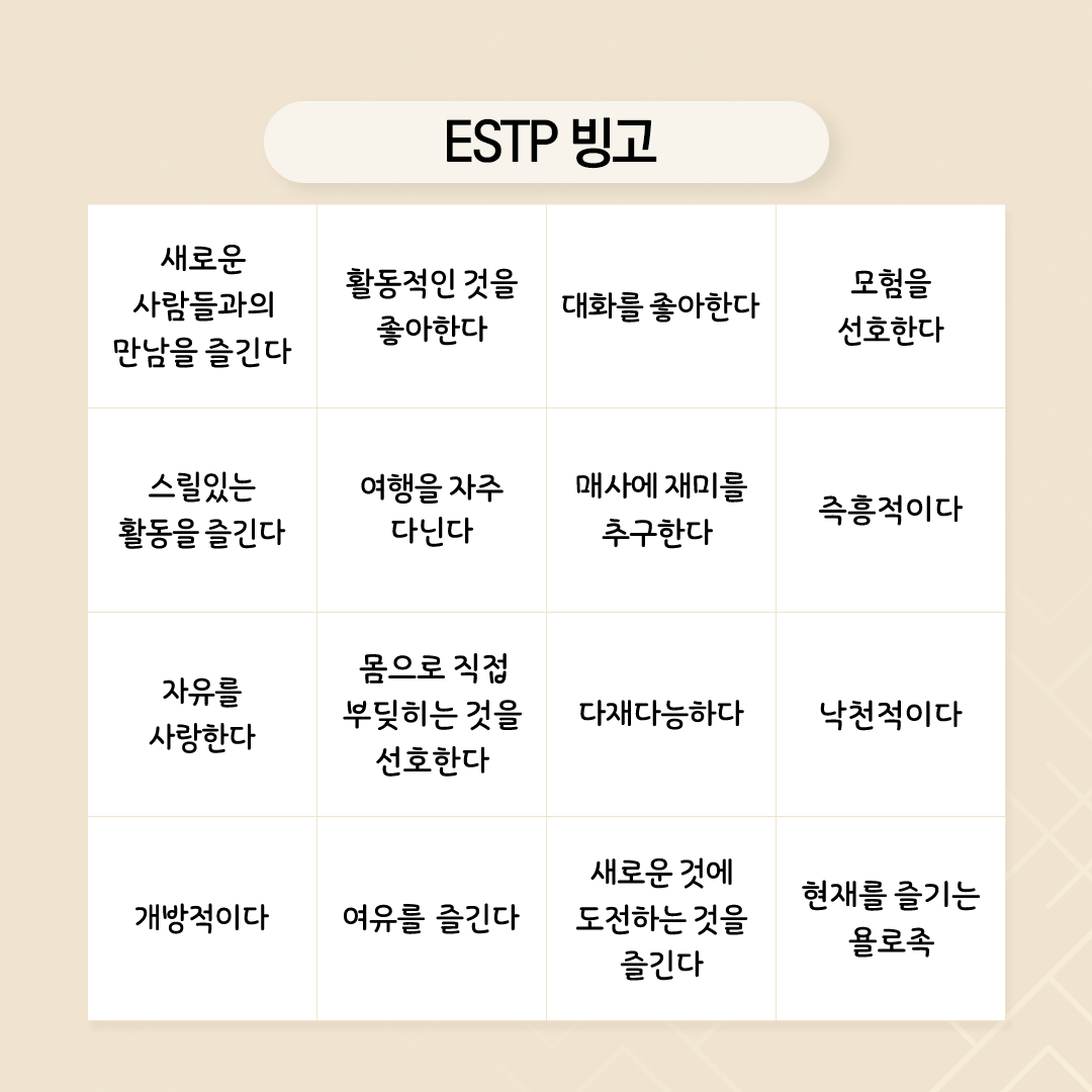 나의 MBTI는? 모험을 즐기는 사업가 ESTP 빙고