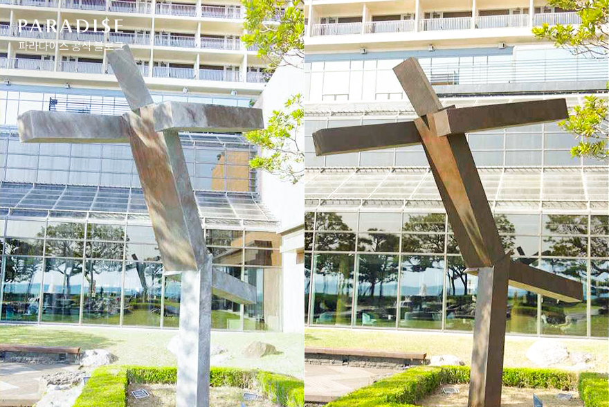 3일을 꽉 채워 진행된 샤피로 작품의 전과 후를 비교해보면 확연히 그 차이를 느낄 수 있는데요. 깨끗하게 샤워를 마치고 원래 작품의 색을 다시 찾은 조엘 샤피로의 조각은 파라다이스 호텔 부산 가든에서 만나 볼 수 있습니다.