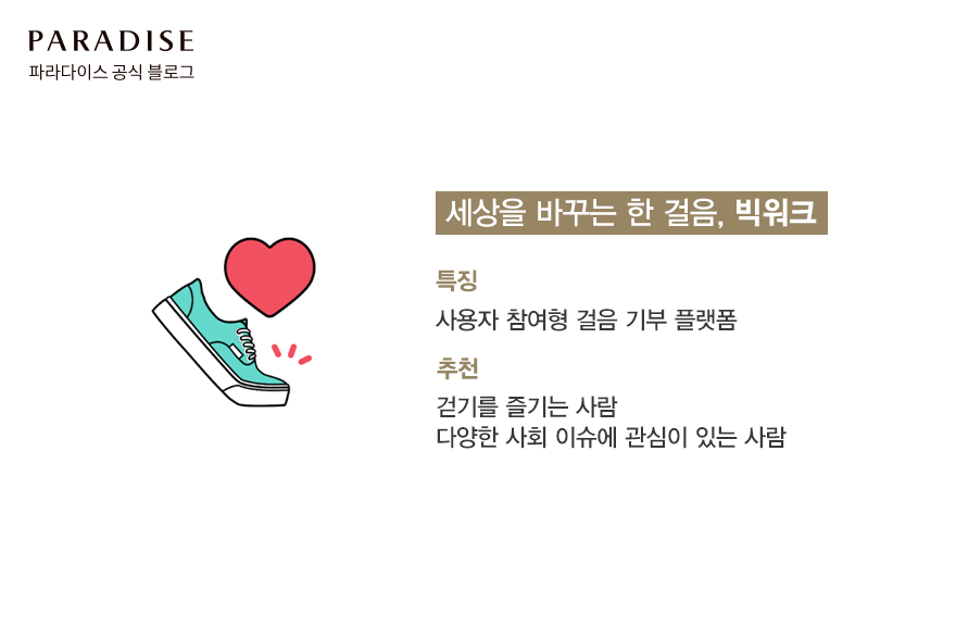 ‘빅워크’는 생활 속 걷기 운동을 실천하면서 관심있는 캠페인에 기부까지 할 수 있는 일석이조의 걸음 기부 앱입니다. 빅워크 앱을 이용하면 이용자들은 자신의 걸음 수를 확인할 수 있고, 이 걸음을 모아 자신이 선택한 캠페인에 기부할 수 있습니다.