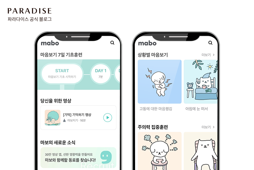 코로나 19의 장기화로 집에서 오랜 시간을 보내며 무력감과 우울함을 느끼는 사람들이 많습니다. 이런 상황 속에서 불확실성과 불안감을 줄이고, 마음의 건강을 돌보는 방법으로 명상이 주목을 받고 있는데요. 국내 명상 앱 ‘마보’는 ‘마음보기’의 줄임말로 명상으로 스스로의 마음을 정화할 수 있는 명상 콘텐츠를 제공하고 있습니다.