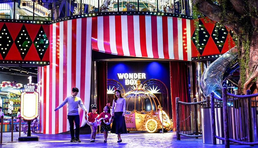 씨메르에 이어 소개할 원더박스는 밤의 유원지를 컨셉으로 한 가족형 실내 테마파크입니다. 원더박스는 다이나믹한 어트랙션과 환상적인 퍼포먼스가 가득해 이색적인 가족 나들이 장소로 자리 잡았는데요. 범퍼카, 회전목마 등 동심을 느낄 수 있는 낭만 가득한 놀이기구부터 7M 높이에서 즐기는 스카이트레일, 국내 최초 360도 회전하는 아찔한 회전 어트랙션 메가믹스, 온가족이 함께 즐기는 짜릿한 자이언트 슬라이드까지. 국내 최고의 복합 엔터테인먼트 리조트, 파라다이스시티 테마파크답게 남녀노소 모두 흠뻑 빠져 즐길 수 있는 다양한 어트랙션이 준비되어 있습니다.