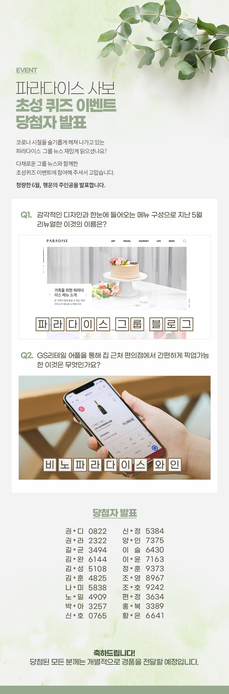 다채로운 파라다이스 그룹 뉴스와 함께한 초성퀴즈 이벤트에 참여해 주셔서 감사합니다. 청량한 6월 이벤트에 당첨된 행운의 주인공을 발표합니다.
