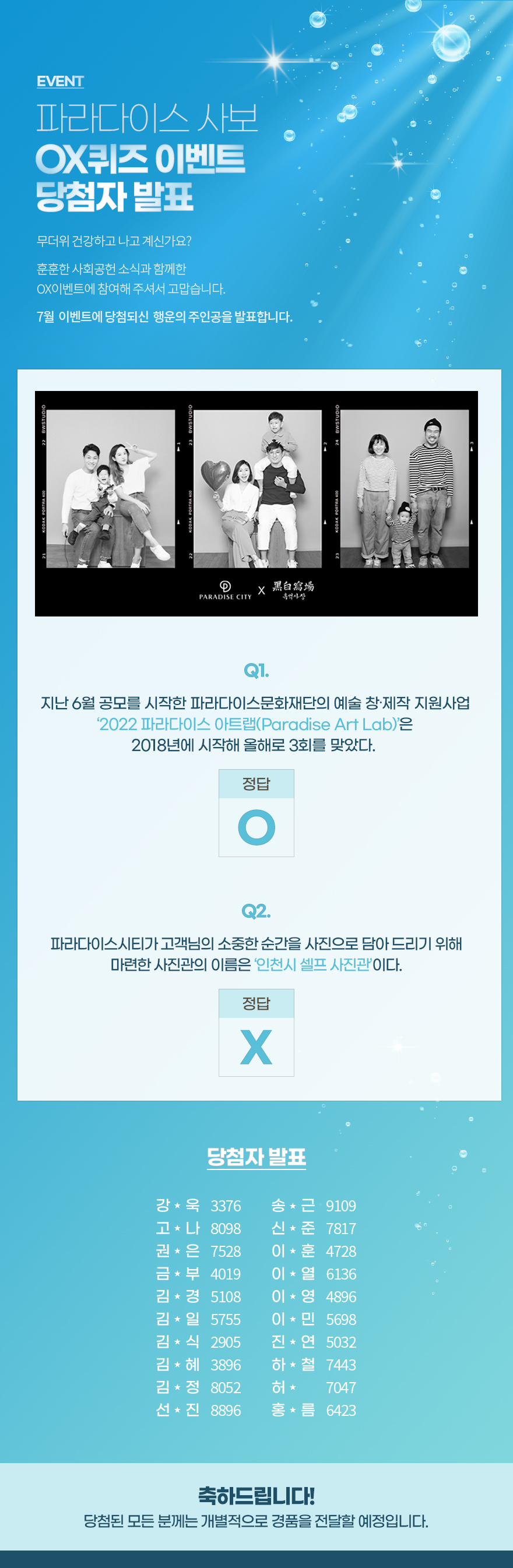 무더위 건강하게 나고 계신가요? 파라다이스 소식과 함께한 OX이벤트에 참여해 주셔서 고맙습니다. 7월 이벤트에 당첨되신 행운의 주인공을 발표합니다.