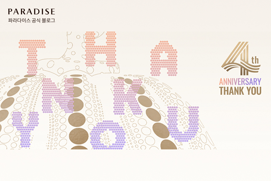 2017년 4월, 동북아 최초 복합 리조트로 인천 영종도에 모습을 공개한 파라다이스시티는 올해로 오픈 4주년을 맞이했습니다. 어느새 인천을 넘어 국내 대표 호텔로 자리한 파라다이스시티는 4년 만에 국내 최고의 관광선도 기업임을 대내외적으로 인정받으며 그 입지를 탄탄히 해왔는데요. 2021년에도 파라다이스시티를 사랑해주시는 많은 고객 분들과 함께 따스한 4번째 생일을 맞이하였습니다.