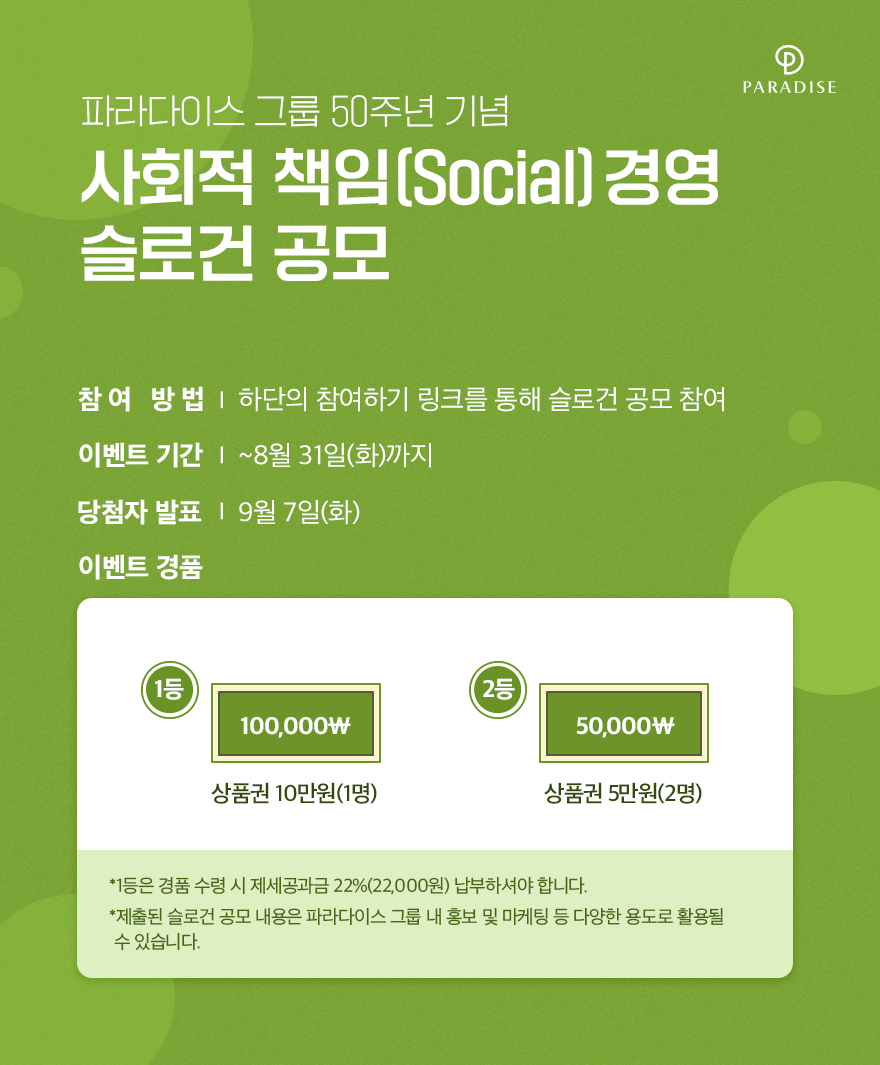 2022년 파라다이스 그룹은 50주년을 맞이하게 되는데요. 이를 기념하여 Social, 즉 사회적 책임 경영에 관련한 슬로건 공모전을 진행합니다.