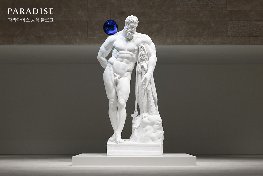 폭넓은 장르의 예술 작품을 전시하고 있는 파라다이스시티의 전시 공간, 파라다이스 아트 스페이스에서는 데미안 허스트, 제프 쿤스 등 세계적인 작가들의 작품을 관람할 수 있는데요. 아트 스페이스에 방문해 가장 먼저 만나볼 수 있는 작품은 미국의 대표적인 현대미술 작가 제프 쿤스의 작품입니다. 제프 쿤스의 조각 작품 <Gazing ball(Farnese Hercules)>는 ‘게이징 볼’ 시리즈 중 하나로, 헤라클레스 석상에 푸른 공을 설치해 푸른 공의 반짝이는 표면에 비친 작품과 관람객 사이의 관계를 표현했습니다.