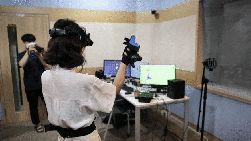 버추얼 애니메이션 제작을 위해 특수 제작된 캡처기를 머리와 팔, 발에 착용한 후, 화면 모니터를 통해 렛시의 움직임을 컨트롤하고 제작합니다. 모션 캡처기와 실시간 엔진은 캡처기를 착용한 사람의 움직임을 실시간으로 측정해 바로 모니터로 송출하게 되죠. 이번엔 김아랑 사원이 직접 렛시가 되어보기로 했습니다.