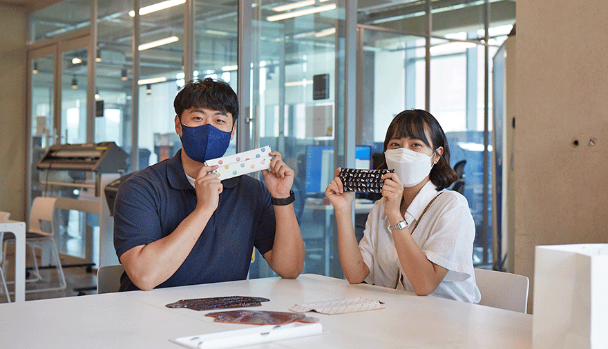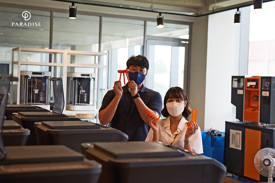본관 파라다이스 홀 2층에 위치한 ‘메이커스 파라다이스(MAKERS PARADISE)’에 들어선 두 사람. 이곳에는 다양한 창작 활동과 창의적인 상상력을 실현시켜주는 3D프린터가 22대 구비되어 있는데요. 고가의 산업체용 프린터도 있어 계원 학생이면 누구나 고퀄리티 출력을 통한 작품 활동이 가능합니다.