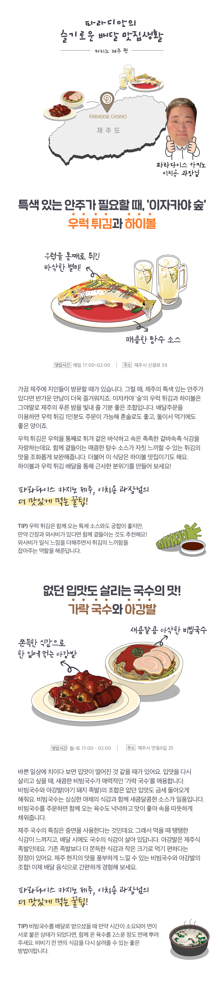 파라디안이 직접 소개하는 파라다이스 근처의 배달 맛집! 이번에는 지난 인천 영종도에 이어, 카지노 제주 편입니다. 특별히 제주 지역의 특색 있는 요리들을 즐길 수 있는 배달 맛집들을 골라보았는데요. 카지노 제주를 방문할 예정이시라면, 맛있는 배달 맛집도 미리 체크해 두시면 어떨까요? 지금부터 낭만적인 제주의 푸른 밤을 더 근사하게 만들어 줄 배달 음식을 소개합니다!