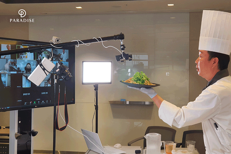 지난 9월 조영진 바텐더의 <편의점 털어 홈 칵테일>에 이어, 10월에는 최교덕 쉐프의 <On the HOME Plate> 랜선 쿠킹 클래스가 열렸습니다. 파라다이스시티의 떡볶이와 미고랭을 집에서도 즐길 수 있도록 만드는 방법과 비법 레시피를 공유했는데요. 선착순 10명에게는 각종 재료를 담은 밀키트를 제공해 직원들의 반응 또한 뜨거웠습니다. 매월 색다른 주제로 오픈되는 클래스 확인 및 신청은 ‘파라인사이트>다모이소>동료학습_학생모집’에서, 강사 추천은 ‘동료학습_강사/멤버 모집’에서 등록할 수 있습니다.