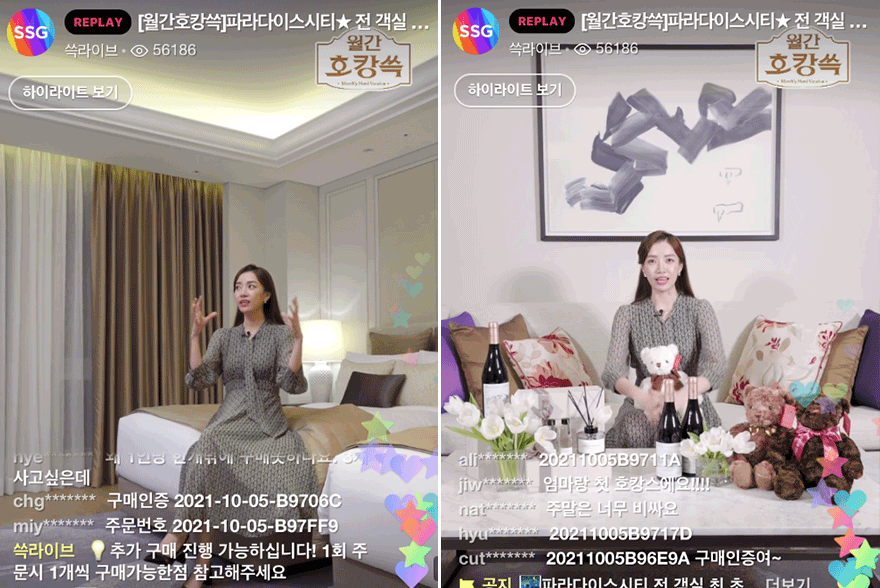 지난 5일 파라다이스시티가 SSG닷컴 라이브 커머스 채널 쓱라이브(SSG.LIVE)에서 호캉스 패키지를 판매 했습니다. 이번 방송에서 파라다이스시티에 대한 고객들의 반응은 뜨거웠는데요. 판매 시작 전부터 어플 내 실시간 급상승 검색어 1위를 기록하는 것은 물론 온라인 커뮤니티에서도 핫한 반응을 이어갔습니다. 방송 중에는 무려 3만여 명의 시청자들이 함께하며 20만여 개의 좋아요를 받았는데요. 끊임없이 이어지는 채팅창은 방송을 더욱 풍성하게 채워줬습니다. 파격적인 상품 구성은 물론 푸짐한 경품 이벤트까지 진행한 이번 라이브 방송은 1,300여 개의 객실이 판매되고 1시간 동안 쓱라이브 사상 최대 매출을 기록하며 성황리에 종료되었습니다.