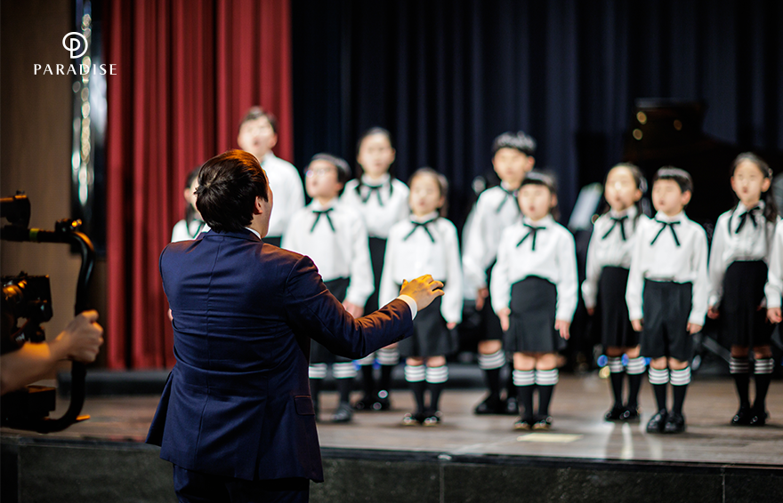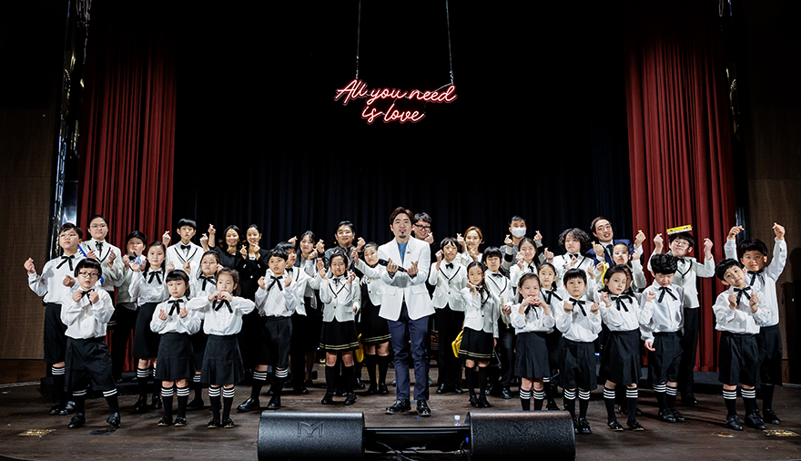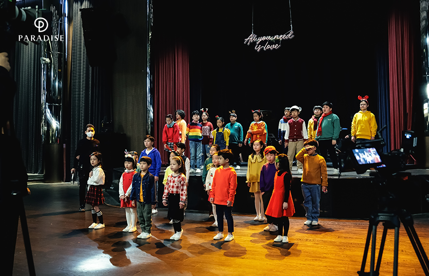 함께 땀 흘리며 연습한 노래들을 드디어 선보이는 날입니다. 11월 27일 어느 주말 오전, 파라다이스시티 루빅홀에 공연 촬영을 위해 합창 단원아이들이 한 명씩 모여들었습니다. 이번 공연에서는 한해 동안 지쳤을 모두의 마음을 위로하는 따뜻한 노래들을 엄선하여 공연했는데요. 영화 <러브액추얼리> OST ‘All you need is love’, 비틀즈의 ‘I will’, 이무진의 ‘신호등’, 창작동요 ‘꼭 안아줄래요’ 등 연말 분위기를 느낄 수 있는 특별한 곡들을 준비했습니다. 1년동안 꾸준히 연습해 온 노래들임에도, 단원 아이들은 긴장한 채 떨리는 마음으로 카메라 앞에 섰는데요. 어색했던 표정도 잠시, 본격적인 촬영이 시작되자 친구들과 함께하는 아름다운 선율이 울려 퍼지기 시작했습니다.