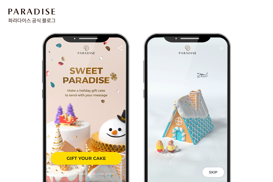 파라다이스 그룹 공식 인스타그램 계정(@paradise__story)의 프로필 링크를 클릭하거나, 다음 링크에 접속하면 파라다이스 홀리데이 카드 작성을 시작할 수 있는데요. 메인 화면의 ‘GIFT YOUR CAKE’ 버튼을 클릭하면 파라다이스만의 감성이 듬뿍 담긴 4종의 귀여운 케이크가 등장하는 인트로 영상을 시청할 수 있습니다.