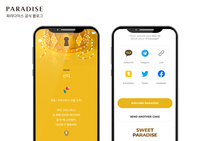 완성된 카드의 URL은 카카오톡과 트위터, 페이스북 등 메신저와 SNS로 간편하게 공유할 수 있습니다. 아래 ‘파라다이스 홀리데이 카드 작성 바로가기’를 눌러 달콤한 케이크 속에 진심을 담아 전할 수 있는 파라다이스 홀리데이 카드를 지금 바로 작성해보세요.