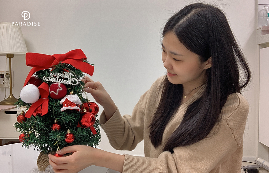 좋아하는 오너먼트를 트리 위에 하나씩 걸어 두며 한 해의 시간을 마무리해보는 것도 특별한 추억이 됩니다. 어떻게 꾸미는지에 따라 완성된 트리의 분위기가 달라지기도 한다는 것이 매력적이죠. 이 세상에 하나밖에 없는 나만의 크리스마스 트리, 파라다이스 임직원들은 어떻게 꾸며보았을까요?