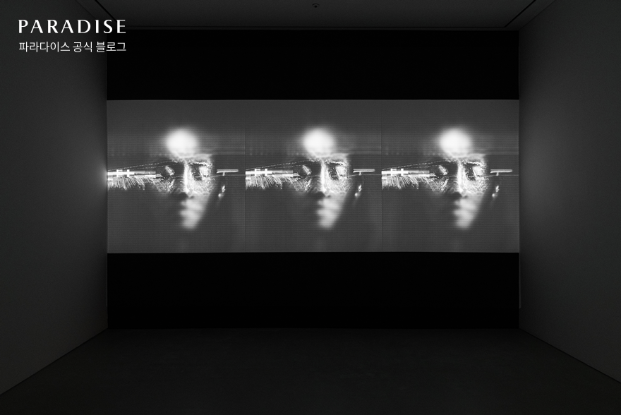 지금까지 자연 환경과 인간의 상호 작용을 표현한 작품을 감상할 수 있었는데요. 그 다음 만난 작품에서는 자연 환경 속에 살아가고 있는 인간의 내면에 집중할 수 있었습니다. 바로 전시관 한 켠에서 넓은 화면으로 송출되고 있는 영상 작품으로 인간의 눈에 대한 이야기를 담고 있는 ‘RETINA_NEW’입니다.
