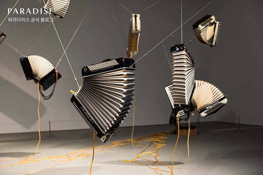 1층에서 작품 관람을 마치고 2층으로 이동해봤습니다. 2층으로 들어서니 어디선가 웅장한 악기소리가 들려왔는데요. 좀 더 안으로 들어가보니 천장에 매달린 아코디언으로 가득 찬 전시 공간이 나타났습니다. 이 작품은 허먼 콜겐의 ‘URBAN WIND’입니다.