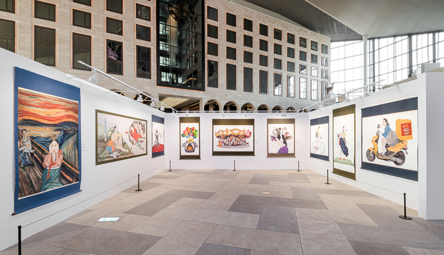 이외에도 고민거리나 걱정거리는 잠시 내려놓고 자전거를 타고 달리고 싶은 기분을 표현한 <내숭:이방인>, 젊은 시절로 돌아가 멋진 삶을 즐기는 엄마의 모습을 담은 <폼생폼사:주부 9단의 봄날>, 햄버거 배달을 애타게 기다리는 마음을 그린 <내숭:나를 움직이는 당신>등 생활 공감을 이끌어내는 메시지를 담은 작품들도 전시되어 있었는데요. 수묵담채화와 서양의 콜라주 기법을 결합한 독특한 스타일의 작품에 모두가 공감할 만한 일상 속 에피소드를 담아낸 점이 흥미로웠습니다.