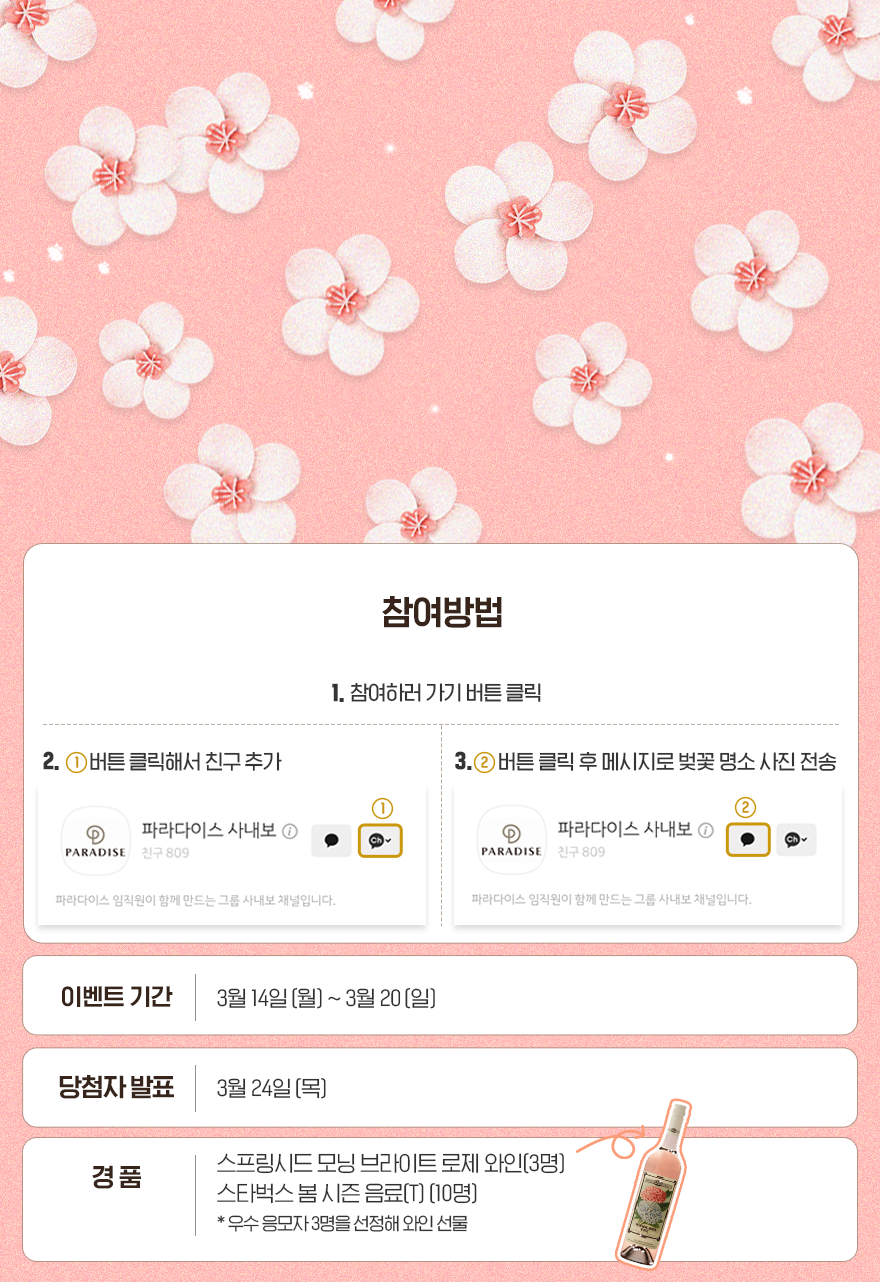 여의도 공원처럼 유명한 명소부터 우리 집 앞 공원과 점심시간마다 걷는 회사 산책로까지. ‘카카오 사내보’ 채널의 메시지를 통해 여러분의 벚꽃 명소를 사진과 함께 공유해 주세요. 선정되신 분들에게는 싱그러운 봄의 향이 물씬 느껴지는 와인과 음료를 전달드립니다😉