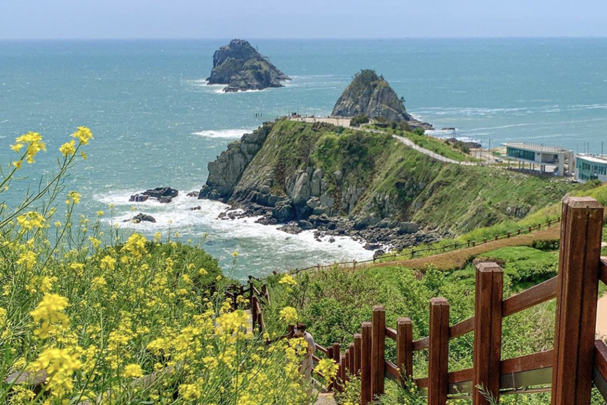 2가지 드라이브 코스의 종착지, 오륙도 해맞이공원에 도착했다면 주차 후 해맞이공원에 발 도장을 찍어 보세요. 3월 말부터 4월 초까지의 해맞이공원은 푸른 바다와 해안 절벽을 타고 피어 있는 유채꽃을 만날 수 있는 시기인데요. 푸른 바다의 파도 소리, 그리고 노오란 수선화와 유채꽃의 조합은 오직 이 계절에만 눈에 담을 수 있습니다.