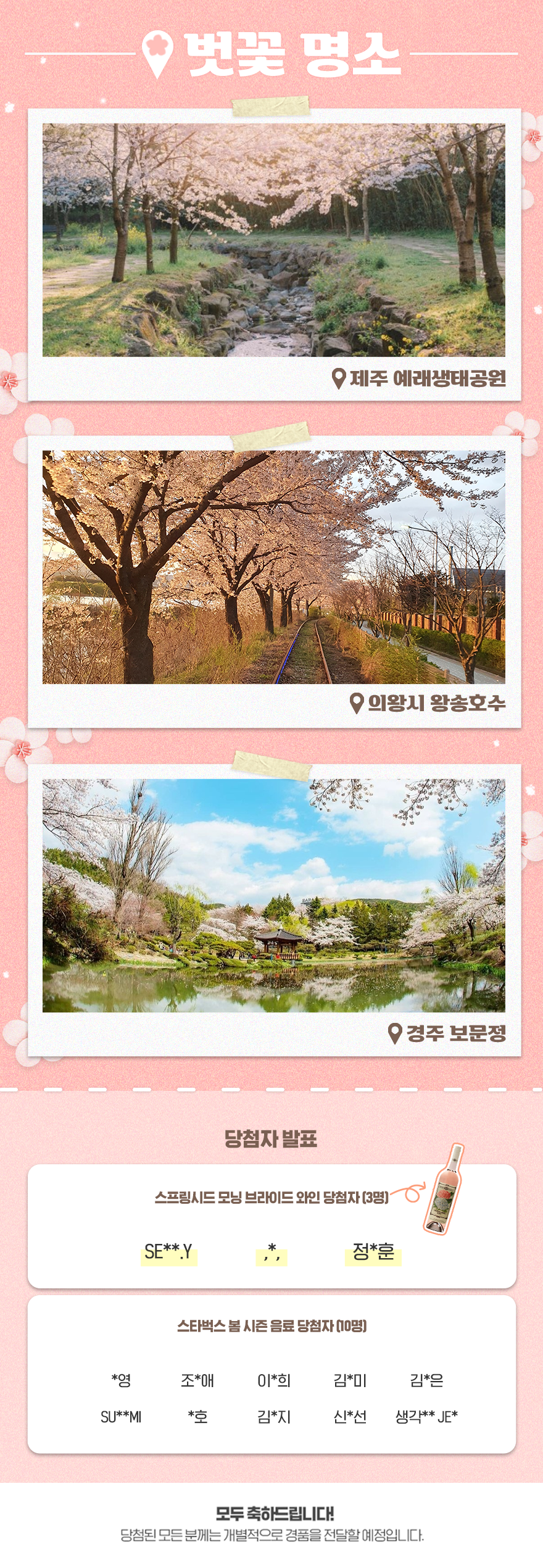 지난 한 주 동안 많은 분들이 카카오 채널을 통해 벚꽃 명소를 보내주었습니다. 서울의 빼놓을 수 없는 명소 석촌 호수부터 신라의 역사가 살아 숨 쉬는 경주의 보문정 그리고 우리 동네 집 앞 벚꽃길까지. 당첨 결과와 함께 사보친구들이 추천한 벚꽃 명소를 확인해보세요. 다가오는 개화 시기에 맞춰 가족, 연인, 친구들과 추천 벚꽃 명소를 방문해 보면 어떨까요?😄