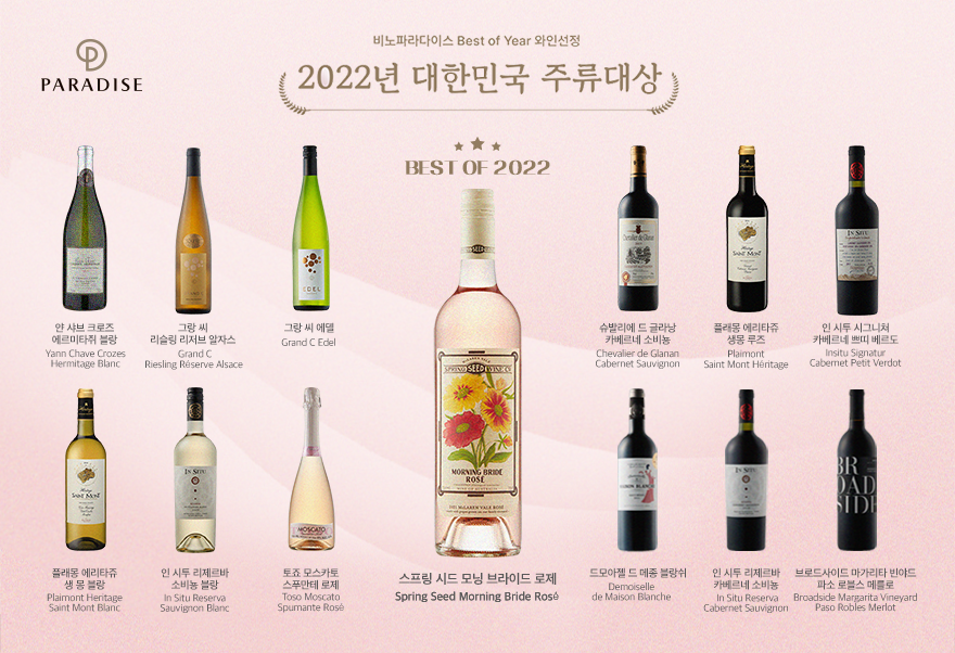 ‘베스트 오브 2022’는 부문별 최고의 점수를 받은 와인으로 로제와인 부문에서 ‘스프링 시드 모닝 브라이드 로제’가 그 수상의 영예를 안았습니다. 이 외에도 비노파라다이스의 13종의 와인들이 와인 8개 부문 중 6개 부문에서 대상을 수상하며 그 위상을 입증했는데요. 전문가들의 까다로운 심사를 거쳐 선정된 비노파라다이스의 수상 와인 13종을 확인하고 품격 있는 맛을 경험해보세요.