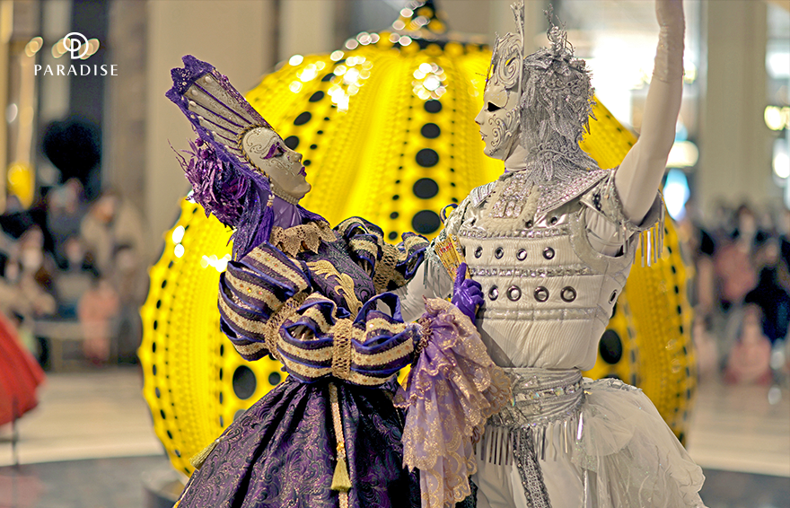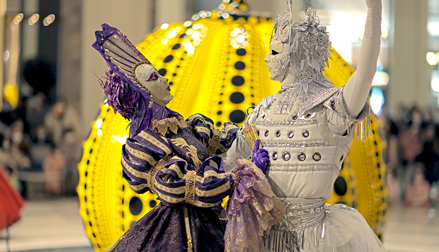 파라다이스시티 호텔 1층 쿠사마 야요이의 작품이 자리잡은 ‘와우존’에는 파라다이스시티만의 가면무도회 ‘마스커레이드 쇼’가 진행됩니다. 베네치아 카니발을 연상케 하는 의상을 입은 퍼포머들이 호박 작품 주위를 돌며 모두의 시선을 사로잡습니다. 라이브로 연주되는 바이올린 선율과 우아한 춤 동작이 어우러져 환상적인 분위기를 자아내죠. 호텔을 지나 ‘플라자’에 다다르면 흥겨운 유러피안 유랑단의 무대가 펼쳐집니다. 서커스, 마술, 댄스가 결합된 다채로운 무대로 색다른 경험을 선사합니다.