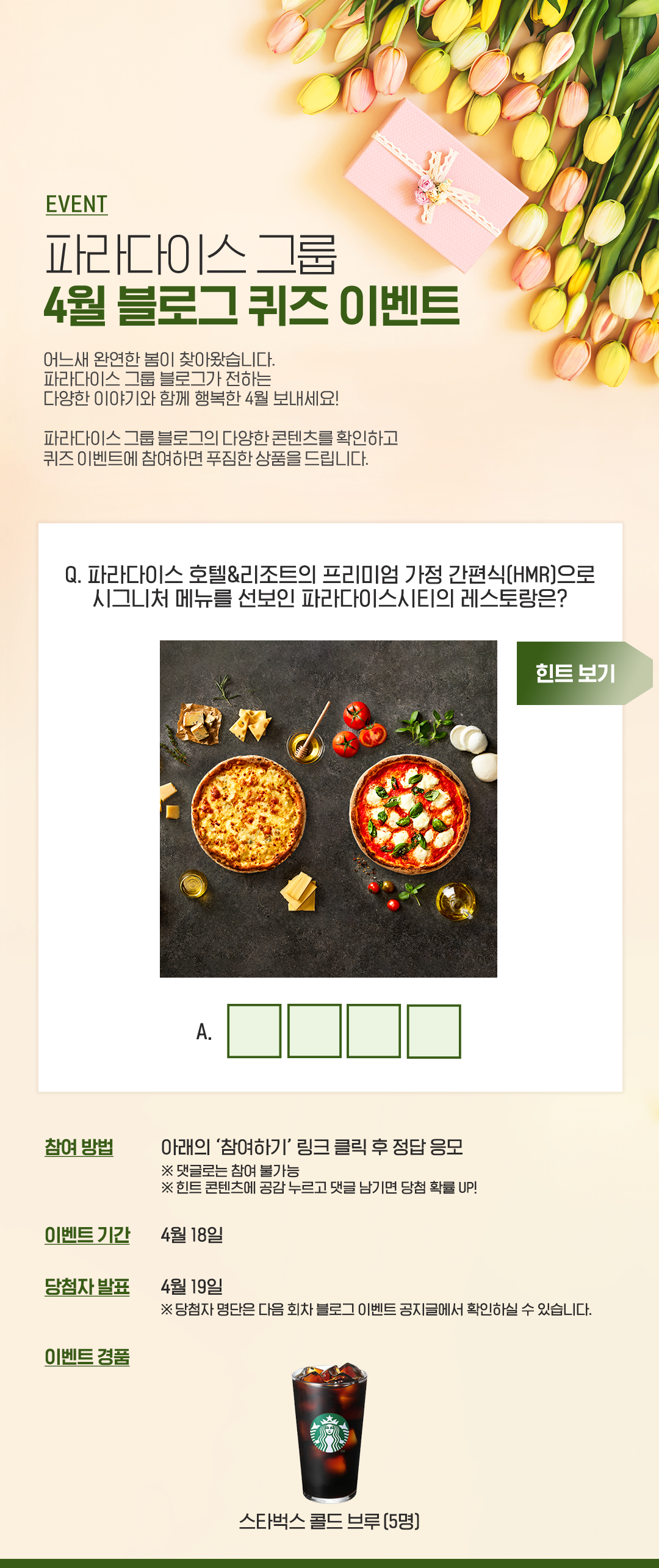 | 파라다이스 그룹 4월 블로그 이벤트 (3회차) & 2회차 당첨자 발표 (37) | 2022.04.20 |