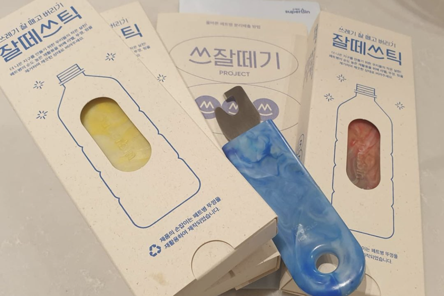 지구샵을 방문했다면 완벽한 분리배출에 도움을 주는 ‘잘떼스틱’을 만나보세요! 페트병은 비닐 라벨과 뚜껑, 링을 제거한 다음 라벨은 비닐류, 뚜껑과 링은 유색 플라스틱, 페트병은 투명 플라스틱으로 배출해야 하는데요. 잘떼스틱은 페트병의 비닐 라벨과 링을 쉽게 제거할 수 있도록 도와줍니다.