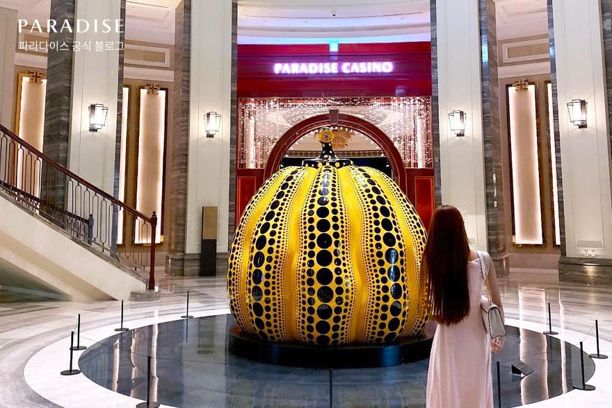 쿠사마 야요이의 호박 작품, ‘Great Gigantic Pumpkin’은 파라다이스시티의 시그니처 포토 스팟으로, 파라다이스시티에 방문하신 많은 분들이 인증 사진을 남겨 주시는 곳입니다. 파라다이스 카지노가 사진에 담길 수 있는 방향으로 촬영하면 더 이국적이고 화려한 분위기의 인증샷을 남길 수 있으니 참고하세요!