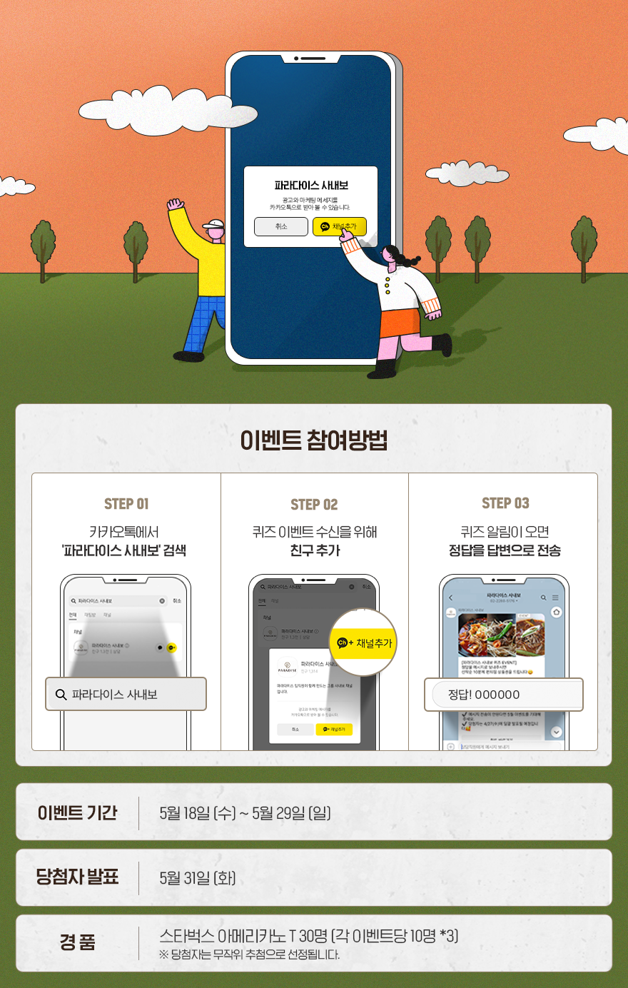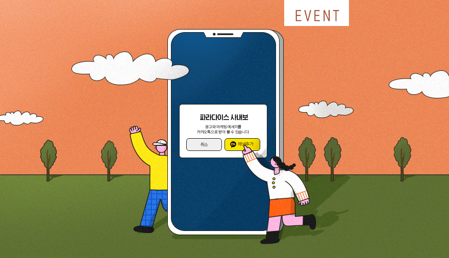 '파라다이스 사내보’는 매월 카카오톡을 통해 구독자분들에게 그룹의 다양한 소식과 이벤트를 전해주고 있습니다. 5월의 이벤트로는 파라다이스와 관련한 3개의 퀴즈를 준비했는데요. 알람 소리와 함께 언제 찾아올지 모르는 사보의 카톡 퀴즈를 기대해 주세요. 이벤트에 참여하시려면 카카오톡 ‘파라다이스 사내보’ 채널 추가는 필수입니다 😉