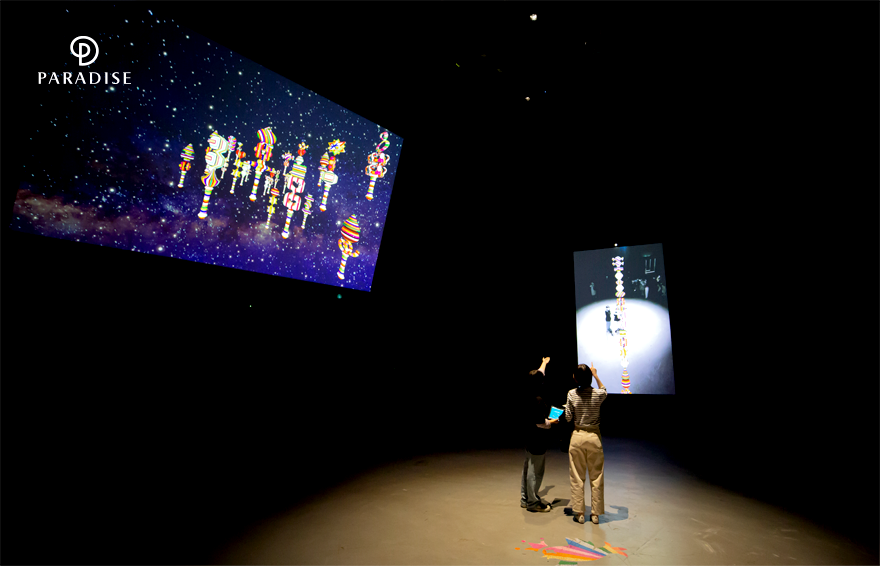 6개의 작품이 전시된 ‘스튜디오 파라다이스’에 첫 발을 내딛는 순간, 어두운 공간에 자리잡은 웅장하고 화려한 작품들이 눈길을 사로잡습니다. 파라디안이 처음으로 체험한 작품은 도로시엠윤의 <염원의 색동 요술봉 탑>입니다. 그곳에서 염원이 담긴 나만의 색동 요술봉을 만들어볼 수 있죠. 현장에 비치된 태블릿에 평소 바라던 소원을 작성한 후 기계를 들어 주변을 비추면 신기하게도 화면 속에 유니크한 모양의 도형들이 나타납니다. 이 작품은 AR 기술이 결합된 것으로 공간 곳곳을 다니며 원하는 도형을 선택해 나만의 요술봉을 만들 수 있죠. 서로의 완성된 요술봉을 비교하며 인증샷을 남긴 사보기자단은 직접 참여하며 느낄 수 있는 아트랩 작품들에 매료되기 시작합니다.