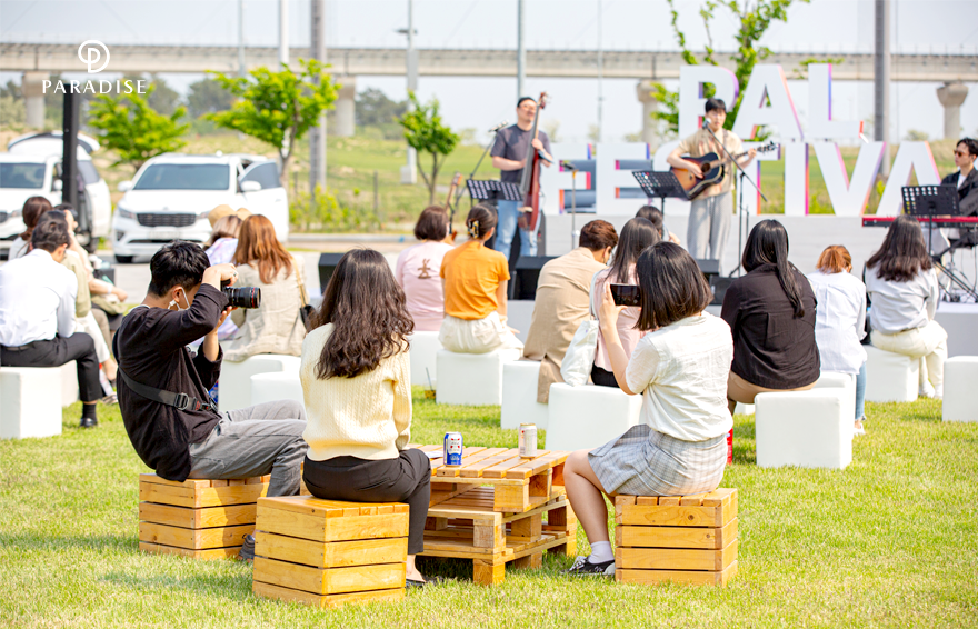 파란 하늘 아래 초록빛 잔디밭 위에서 펼쳐지는 신나는 버스킹 공연은 활기찬 예술 축제의 분기를 더욱 고조시켜줍니다. 올해의 파라다이스 아트랩은 작품 전시 관람은 물론 음악공연, 토크쇼, 카크닉, 키즈프로그램 등 다양한 즐길 거리도 가득합니다. 오랜만에 야외 페스티벌을 즐기는 파라다이스 사보 기자들의 얼굴에는 신나는 미소가 번졌습니다. 오늘의 공연은 싱어송라이터 ‘김제형’씨의 무대였는데요. 초여름과 잘 어울리는 청량한 사운드가 일상에 지친 마음을 위로해주는 것 같았습니다.