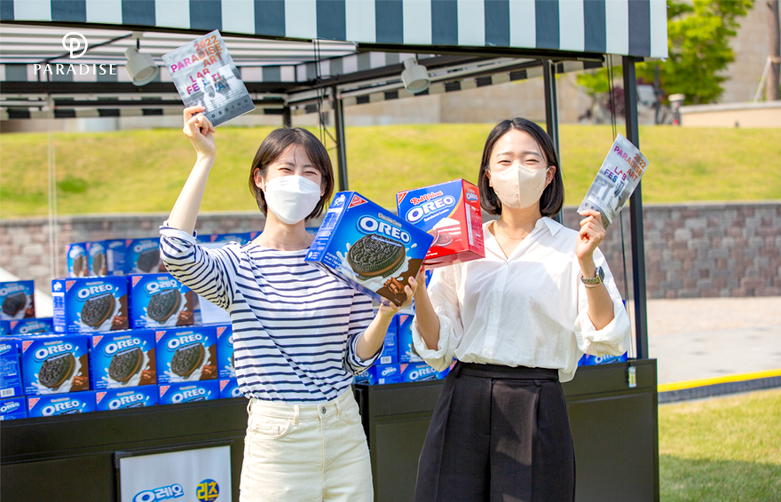 넓은 야외 공간에는 MZ세대의 취향을 저격할 각종 브랜드의 부스들도 눈에 띄었습니다. 사보기자들은 삼삼오오 나뉘어 취향에 따라 좋아하는 브랜드의 협업 스토어를 방문하기도 했는데요. 오레오&리츠 부스에선 SNS 인증 이벤트에 참여해 맛있는 과자를 선물 받고 러쉬에서는 기분까지 좋아지는 바디 케어 제품들을 체험해 보았습니다. 이 외에도 UUU의 천연 비누 부스와 eAeon의 음악 감상 체험존까지 2022 파라다이스 아트랩 페스티벌에는 누구나 즐겁게 체험할 수 있는 풍성한 프로그램들로 가득했습니다.