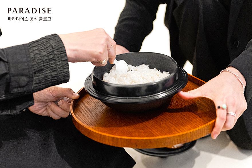 밥을 지어 나누어 먹는 행위는 모두가 파라다이스 ZIP의 일원, 즉 식구가 된다는 것을 의미합니다. 검정 또는 흰색의 드레스코드를 맞추고, 쌀 한줌과 구슬을 가져온 관객은 누구나 참여 가능한데요. 파라다이스 ZIP에도 쌀과 구슬이 마련되어 있으니 퍼포먼스에 꼭 참여해 작가와 함께 특별한 기억을 쌓기를 바랍니다.