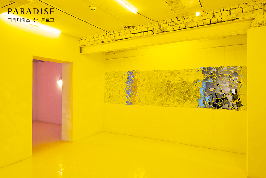 흰색, 파란색, 빨간색, 노란색의 네온사인을 지나 걸음을 옮기면 수많은 거울 조각으로 이루어진 작품이 관객을 기다리고 있습니다. 버려지거나 중고 시장에서 무료로 나눔 받은 거울 40여 개를 작가가 직접 수집하여 조각을 낸 후 벽에 부착한 것인데요. 거울 속 분절된 나의 모습을 보며, 누군가가 사용한 거울에 담긴 이야기와 사람들의 에너지를 직접 느껴보기 바랍니다.