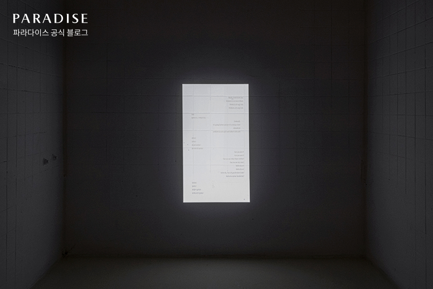 미디어 아티스트 송미경은 영상과 소리, 문자 등 다양한 형태의 기록을 재해석하고 창조하는 작업을 이어왔습니다. ‘낙원의 집’ 전시에서도 텍스트를 자음과 모음으로 분열하고, 이를 사운드로 다시 만들어낸 작품들을 만나볼 수 있었는데요. 파라다이스 ZIP에 들어서면 ‘우리에겐 낙원이란 존재하는가’라는 작가의 질문과 함께 전시가 시작됩니다. 그리고 텍스트로 된 이 질문을 작가만의 규칙에 따라 소리로 바꾸어 작곡한 음악이 전시 공간을 달래듯 울려 퍼집니다.
