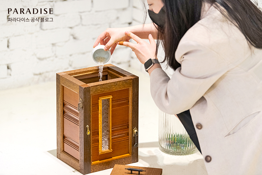 ‘낙원의 집’ 작품을 모두 감상했다면 전시 기간 중 상설 퍼포먼스로 진행되는 ‘밥과 구슬’에도 참여해보세요. 한국에서는 밥을 함께 지어 먹으면 식구가 된다는 이야기로부터 시작된 ‘밥과 구슬’은 전시장 내 함에 쌀을 모았다가 밥을 지어 관객과 나눠 먹는 퍼포먼스입니다.