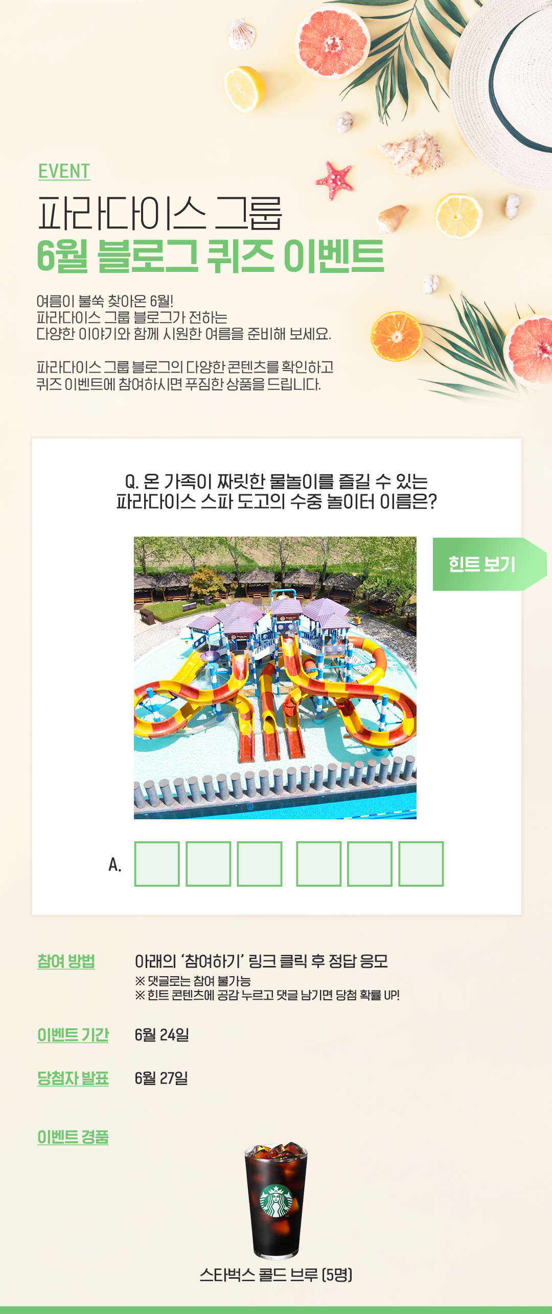 | 파라다이스 그룹 6월 블로그 이벤트 (3회차) & 2회차 당첨자 발표 (48) | 2022.06.22 |
