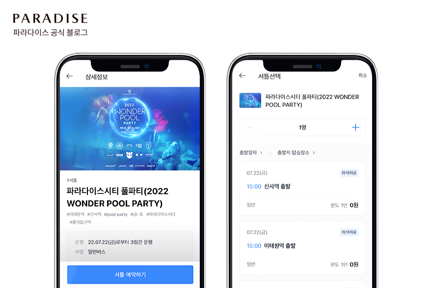 이외에도 풀파티만을 위한 무료 셔틀버스가 운영됩니다! 카카오 T 앱에 접속해 ‘셔틀’ 서비스를 선택하면 ‘2022 WonderPool Party’ 셔틀버스 정보를 확인할 수 있는데요. 22일과 23일 15시에 신사역, 이태원역에서 파라다이스시티로 향하는 셔틀버스가 출발하며, 23일과 24일 01시에 파라다이스시티에서 신사역, 이태원역, 홍대입구역으로 도착하는 셔틀버스가 운영됩니다. 카카오 T 앱에서 예약하여 보다 간편하게 파라다이스시티를 방문해보세요!