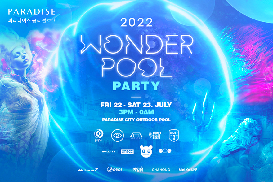 파라다이스시티가 지난 2019년에 이어 3년 만에 개최하는 화려한 여름 축제, ‘2022 WonderPool Party’! 이번 풀파티에는 데일리 청담, 스킨 압구정, 스낵 압구정, 바블 신사, 페이퍼 이태원, 터널 이태원, 쉘터 이태원, 레거시 이태원, 더티로즈 클럽 이태원 등 현재 국내에서 가장 핫한 클럽과 라운지 9곳이 함께해 더욱 풍성한 파티를 만들 예정인데요.